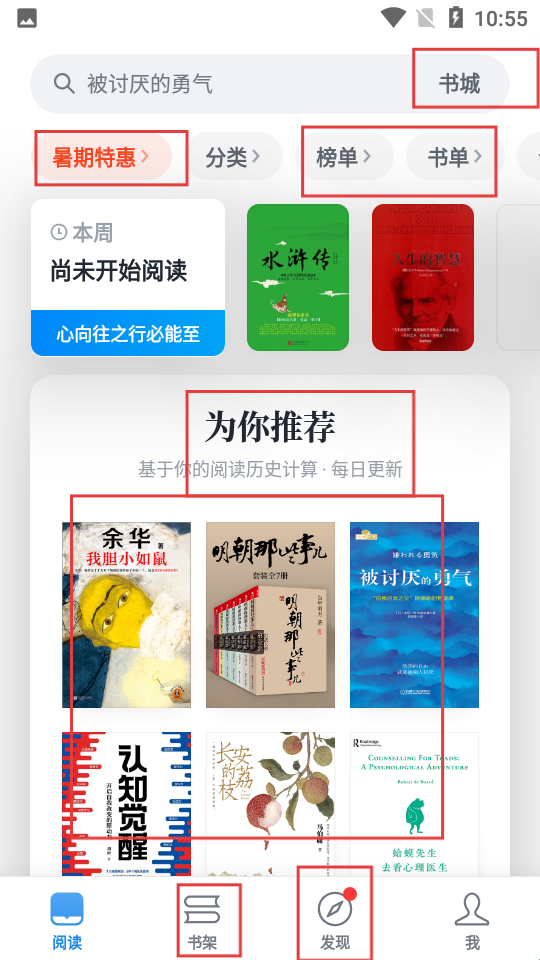 2.读书界面布局清晰,书城.暑期特惠.榜单.书单等板块,搭配为你推荐个性化内容,底部书架.发现等导航栏,方便用户找书阅读