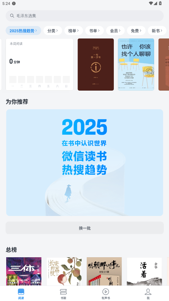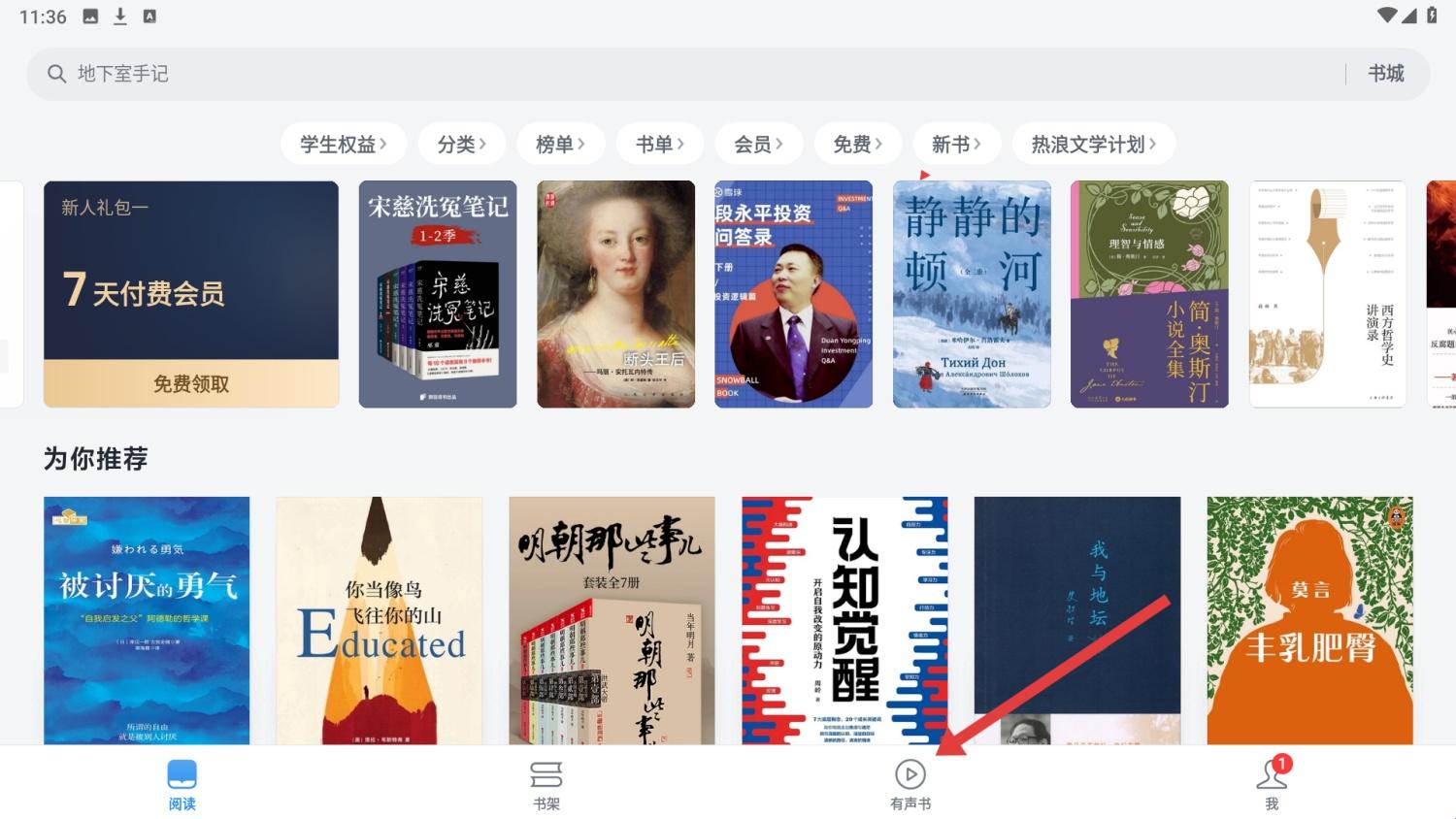 1.进入读书阅读主界面,可看到搜索栏.多个功能入口及各类推荐书籍,点击底部有声书选项,可进入有声书板块。