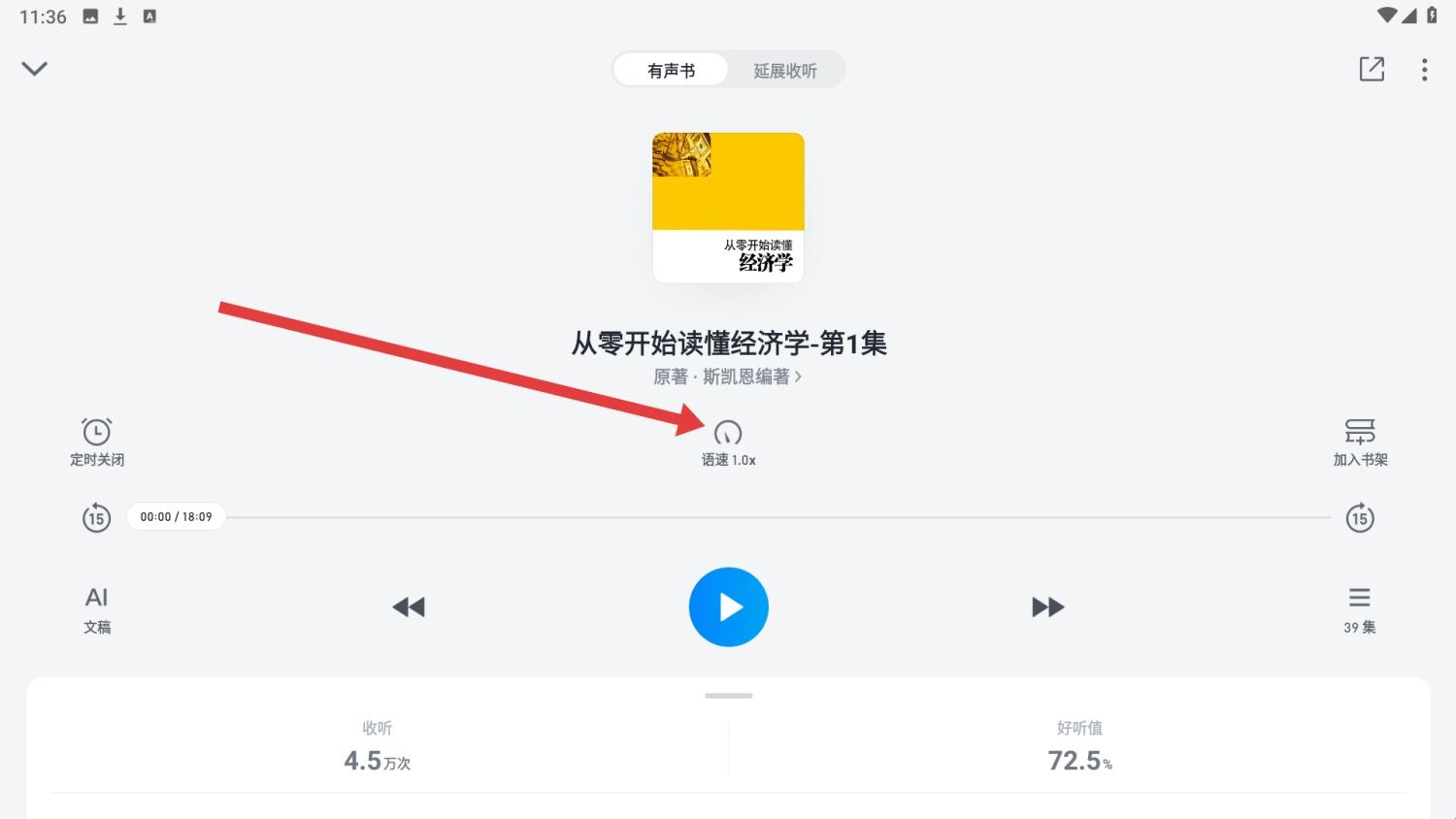 3.进入有声书播放界面后,可看到定时关闭.语速调节等功能选项,点击语速按钮,可调整有声书的播放语速。