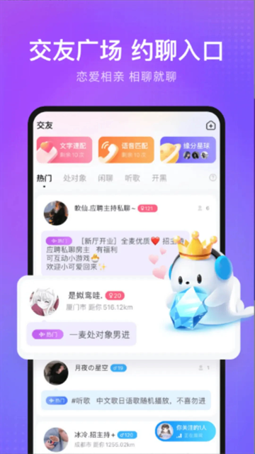 轻语是一款深受年轻人喜欢的语音交友应用软件,在该应用中用户可以结交更多的异性,帮助用户早日脱单,开启定位,你可以找到附近的用户结交,趣味相投的聊天可以在熟悉的时候线下见面。软件汇集来自五湖西海的小伙伴们,在这里你可以找到有趣的男朋友/女朋友,互换虚拟礼物,听到有趣的声音,碰到有趣的灵魂。快来一起玩耍吧!