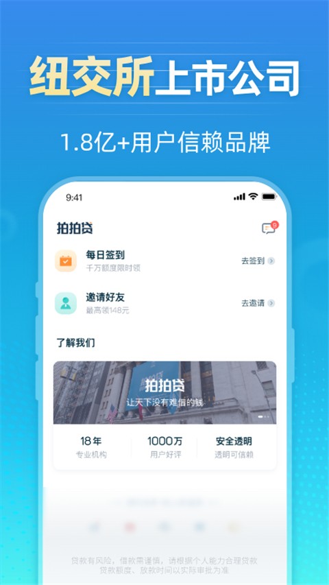 拍拍贷借款是上海拍拍贷金融信息服务有限公司开发的一款手机借贷软件。拍拍贷借款app具有门槛低、无抵押无担保等特点,可以通过大数据分析技术来智能匹配用户的信用额度,最快10分钟就可以通过审核,1小时即可进行放款。