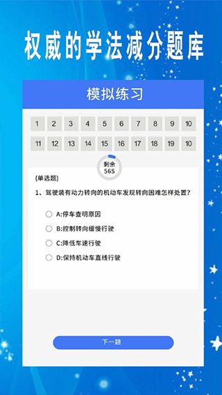 1、顺序练习:根据新的学法减分考试大纲,涵盖小车、客车、货车、摩托车,各地区题库实时更新。