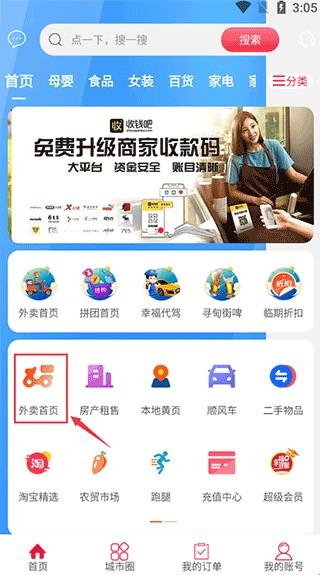 1、首先在本站下载安装好app后,进入到主页面,可以在许多功能中看到首页外卖,我们点击进去。