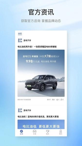 1、官方资讯:推送有蓝电汽车品牌的官方资讯信息,用户可对官方资讯内容详情查看。