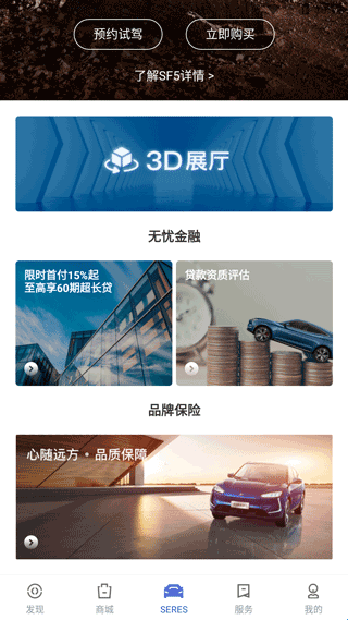3、点开seres,这里有预约试驾、3d展厅、品牌保险等功能;