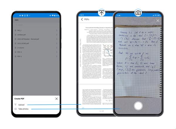 通过导航到“PDF”选项卡并点击“拍照”,您可以通过扫描笔记本来创建手写 PDF。您还可以从设备上传 PDF: