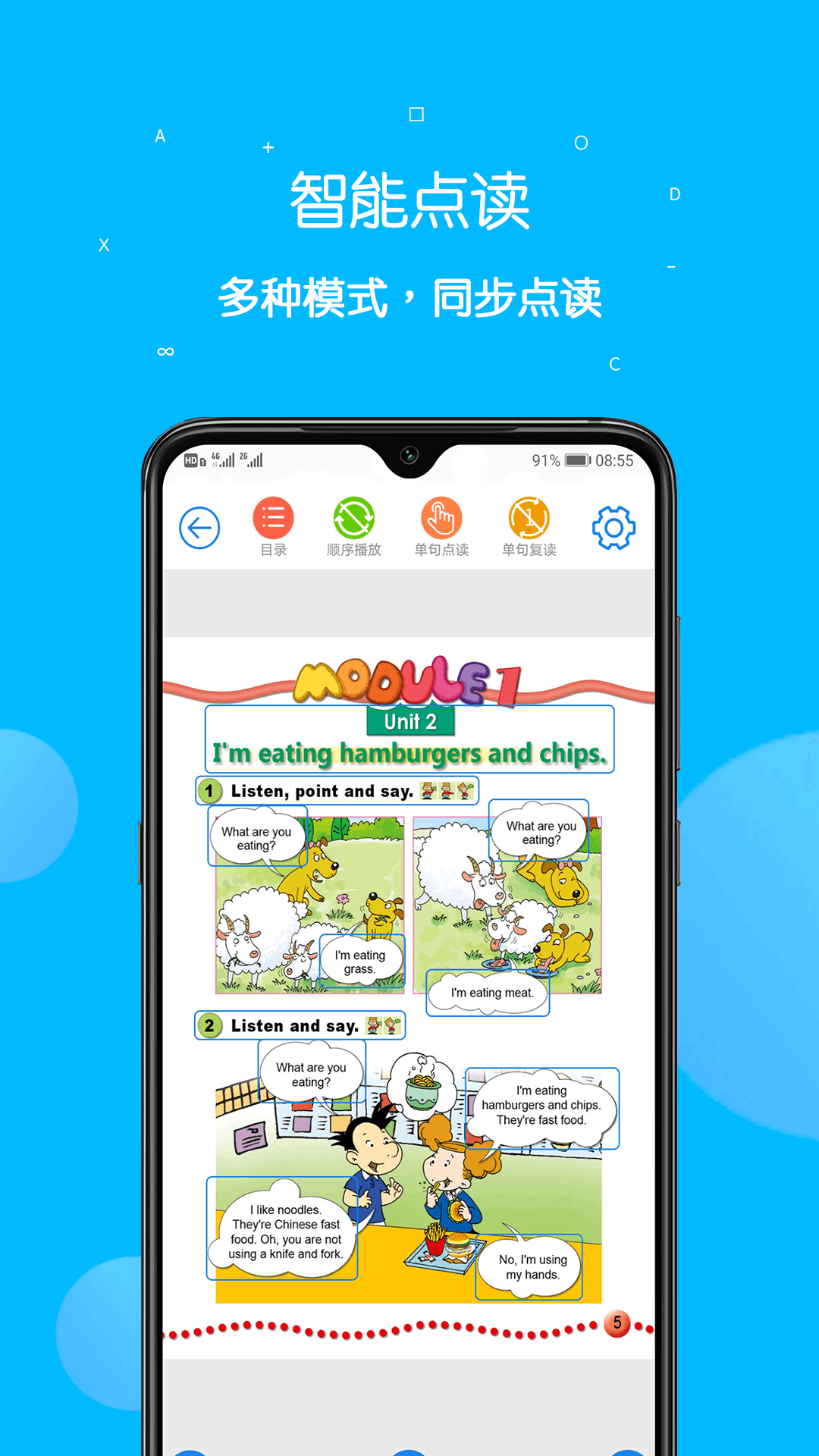 2.【课本点读】同步教材点读,哪里不会点哪里。单句点读、单句复读、顺序播放、智能翻译等多种功能助你学习。