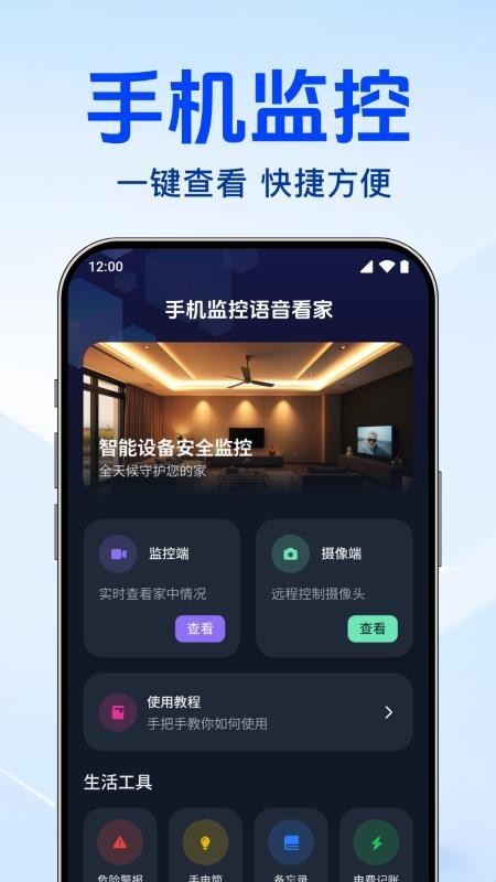 手机监控语音看家是一款专注家庭场景的远程智能监控工具,通过绑定家用摄像头,就能随时随地查看家里的实时画面:既可以和家中的老人、孩子实时语音对讲,也能开启防盗告警功能,一旦摄像头捕捉到异常动静,会立刻推送提醒,全方位帮你守护居家安全,给你满满的居家安心感。