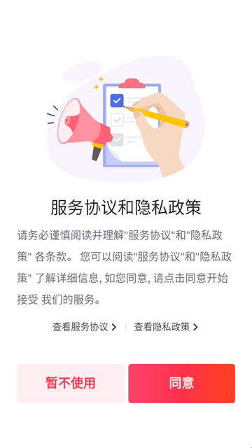 1、下载安装好软件,进入后先必看服务协议和隐私政策。