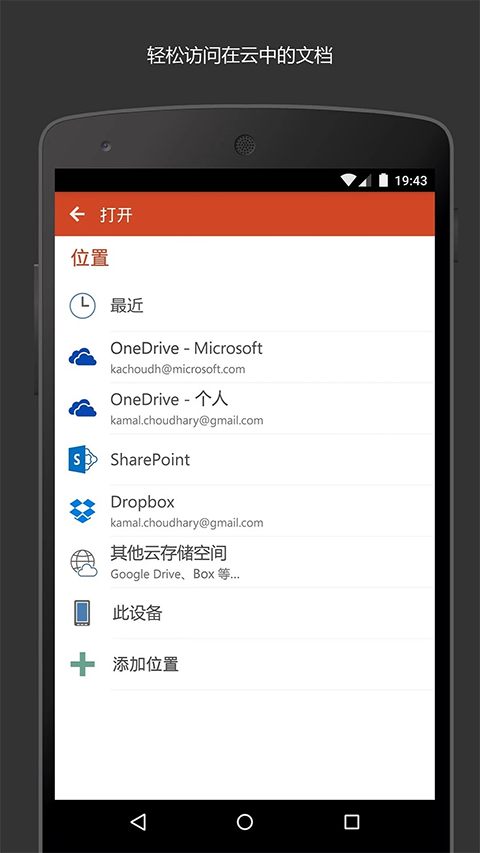13.有了免费的安卓端微软PPT应用,一个简单的点击操作就可以让您随时随地打开文档。您可以把文档存储在OneDrive、oneDrive for Business和SharePoint上,并随时使用多种设备轻松访问。