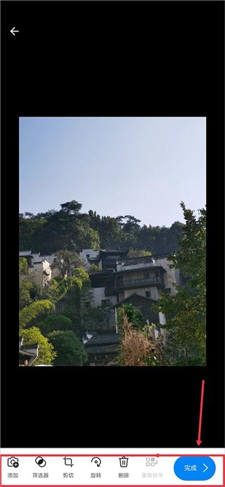 2、点击后会进入手机图库,选择设置背景的图片并点击完成,若需要编辑该图片还可以使用工具再次进行编辑。