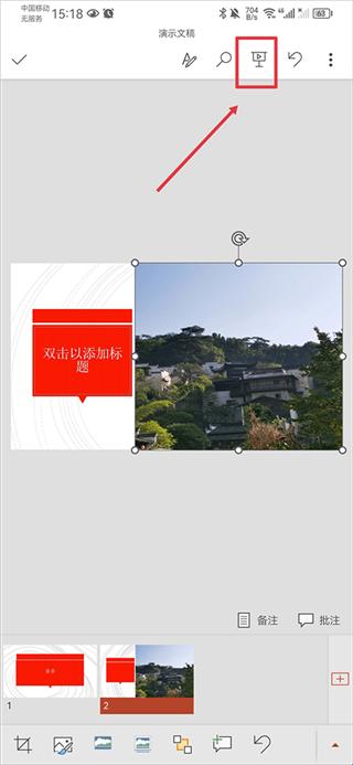 1、当演示文稿编辑完成后点击最上方的播放按钮将进行播放。