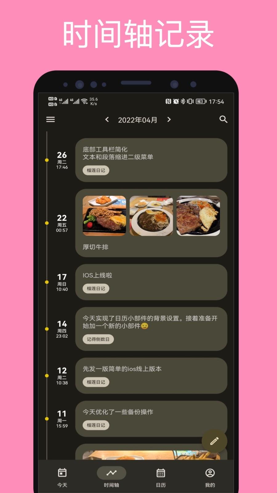 3、简洁时间轴:日记以时间轴形式展现,方便大家快速浏览。