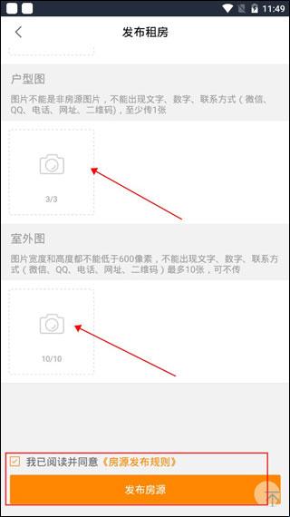5、点击照相机标志苦熬苏上传室内图、户型图、实勘图,上传完成后勾选房源发布规则点击发布房源就可以了。