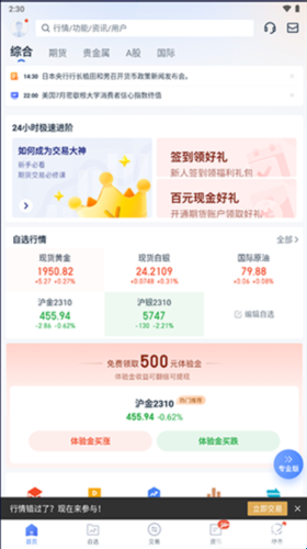 1、口袋贵金属软件首页为综合性的信息查看界面。