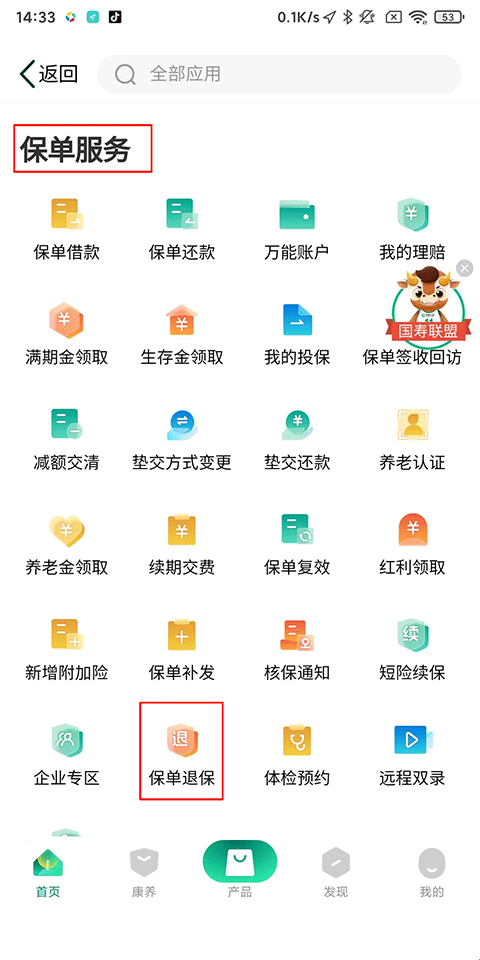 4、在保单服务下找到并打开保单退保,进入依照步骤进行退保即可。
