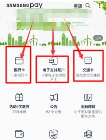 2、然后进入以后,可以看到页面上有三个选项都可以添加进入,接下来的操作是点击银行卡进入。