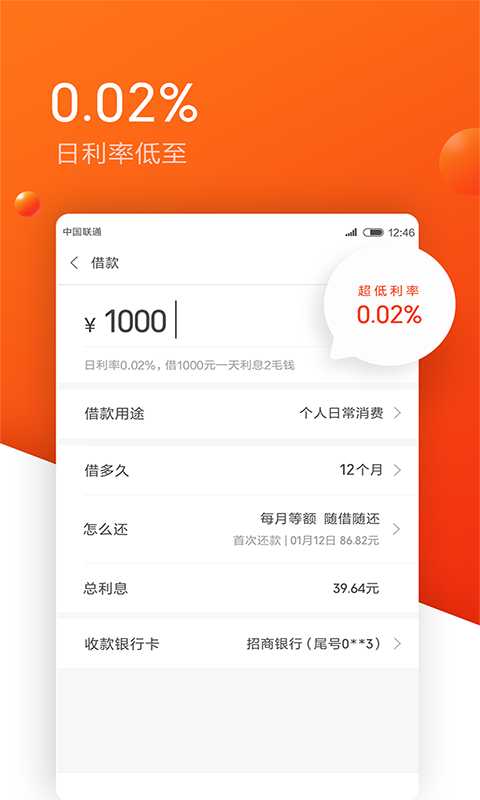 3、优惠资金成本:每日利息低至0.02%,年化利率区间7.2%至24%。