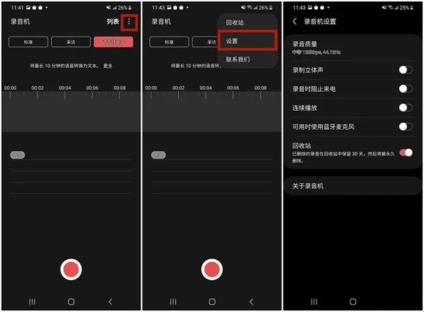 6、录音机设置:除此之外,你还可以在「录音机」里自主设置录音时的各类功能:点开右上角的图标,并打开「设置」就可以开始操作啦~你可以在里面设置调整录音质量,录音立体声和录音时阻止电话来电等功能,这些功能虽小但可以帮助你拥有更加优质的录音环境哦~