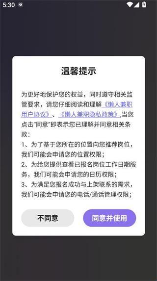 1、在手机上轻松下载并安装懒人兼职app,查看温馨提示后点击同意按钮。