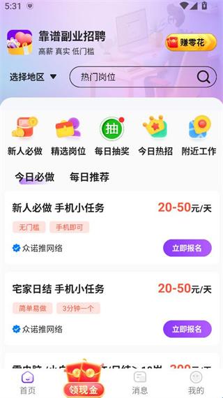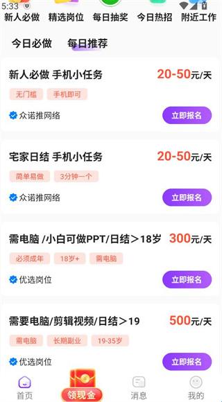3、app首页即展示热门兼职与最新日结岗位,好工作一目了然,让您快速定位心仪之选。