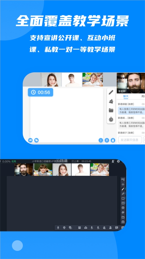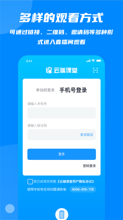 云端课堂App是一款面向线教育行业的直播工具,老师可以在云端课堂App中快速创建和开启直播课,并可通过分享课程邀请给学生,学生可通过中的课程邀请页进入课堂听课,也可在APP中通过输入参加码进入课堂。