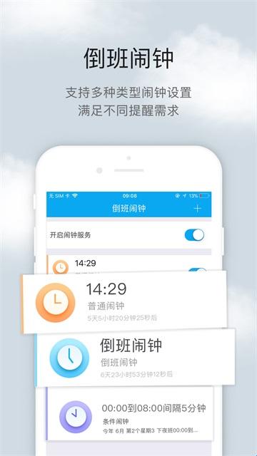 2、支持多种类型的闹钟设置形式,普通闹钟、倒班闹钟和条件闹钟;