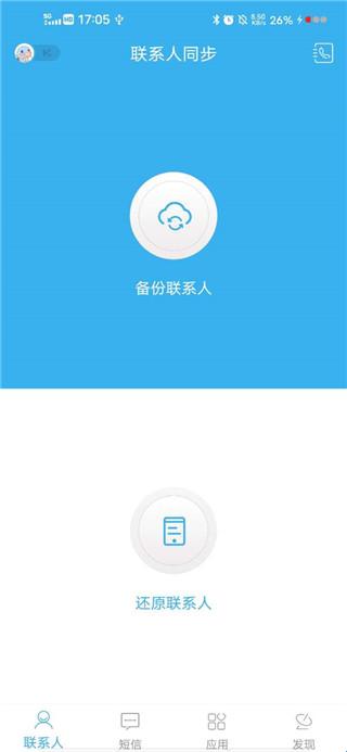 1、下载好app后,点击进入,首先先将自己的联系人备份一次,点击上方的蓝色区域。