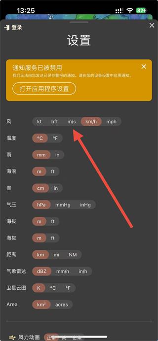 3、在设置页面,找到风的单位设置区域,可选择kt、bft、m/s、km/h、mph等风速单位,点击对应选项即可设置风速单位。