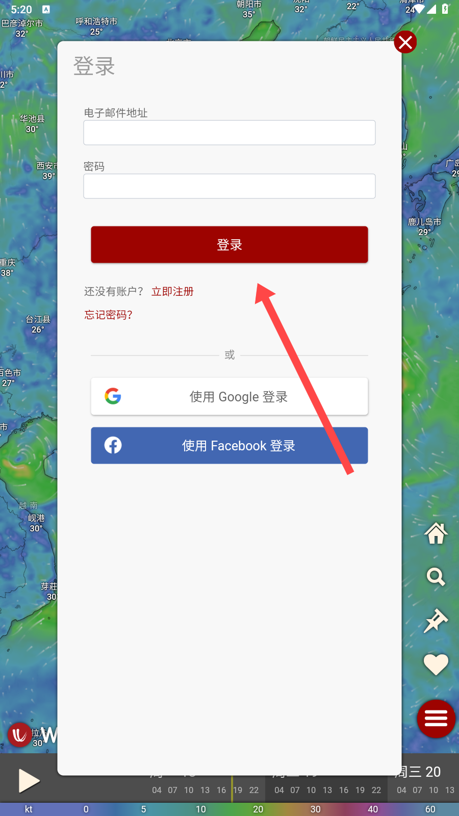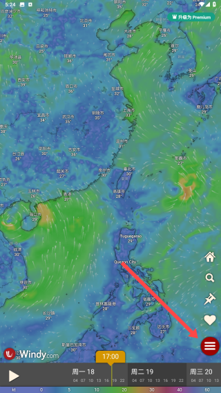 1、打开Windy app,点击右下角红色菜单按钮,展开功能菜单。