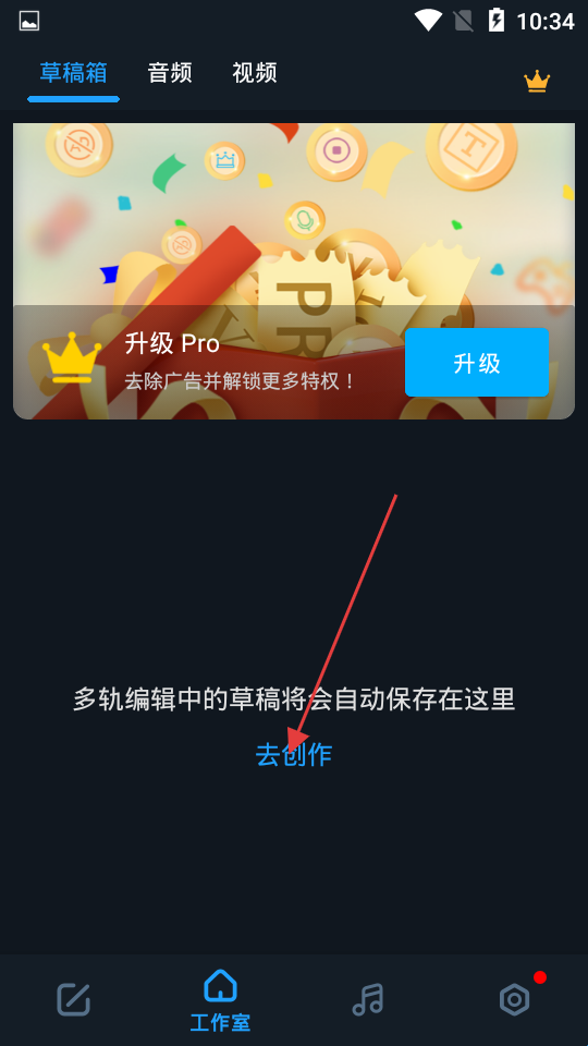 1、打开app进入工作室界面,这里能看到草稿箱、音频、视频分类,无论是新创作还是继续编辑草稿,点击去创作按钮就能开启音频制作之旅。