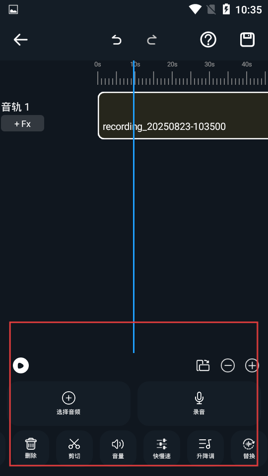 2、进入创作界面后会看到时间轴和音轨显示区域吗,下方操作栏功能丰富,还有选择音频、录音、删除、剪切、音量等编辑功能,满足多样化创作需求。