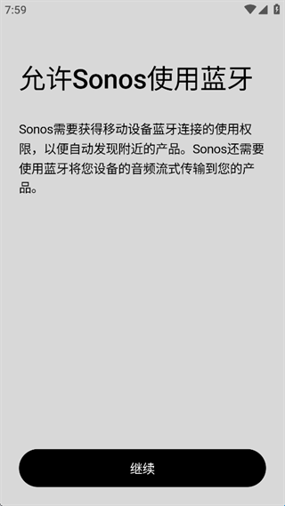 2、点击“继续”允许Sonos使用蓝牙;进入app之后根据需要进行设置或者添加设备;