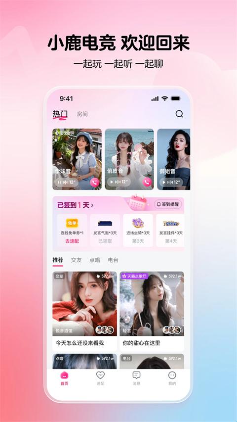 小鹿陪玩是一款新上线的手机陪玩软件,改名为酥音派对,随时随地打开都可在线约玩,全新版本内容更加丰富多样,线上界面功能分类详细,手机用户可根据自己的喜好挑选陪玩人员,让你游戏时不再孤身一人,同时玩家自身也可以作为陪玩人员,在闲暇时间赚取一笔不小的收入,这款软件涵盖的游戏范围十分广泛,用户可以根据自己的需求来选择想要的相关游戏,并根据实际情况来预约最合适自己的陪玩服务,线上操作十分便利,快来下载使用吧,各路大神等着你!
