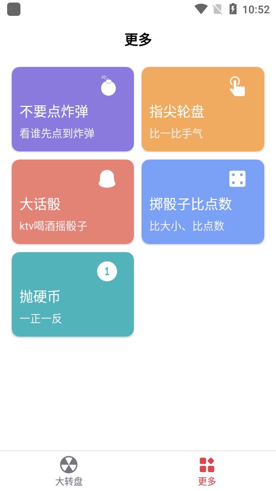 大转盘小决定是一款帮助你做决定的工具,转动你的转盘,决定今天吃什么,穿什么衣服出门,提供超多类型的抽签方式,纠结时一键帮你做出选择,随机的算法生成结果。同时该软件内还有非常多特色掷色子内容,趣味性十足,有需要的小伙伴们千万不要错过,软件的所有的功能都是可以免费使用的,快来下载体验吧!