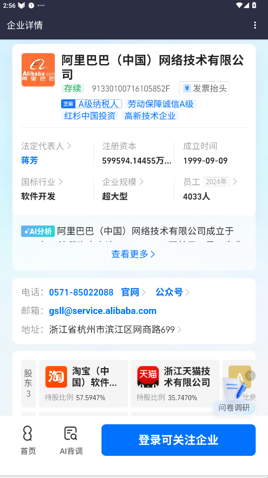 88查APP是阿里巴巴旗下的免费企业信息查询工具,拥有超过2亿家国内公司的数据,功能强大且使用便捷。它支持AI驱动搜索,能够快速找到所需企业信息,涵盖多维度查询,88查提供AI企业背调功能,帮助用户快速了解企业背景、优势和亮点。