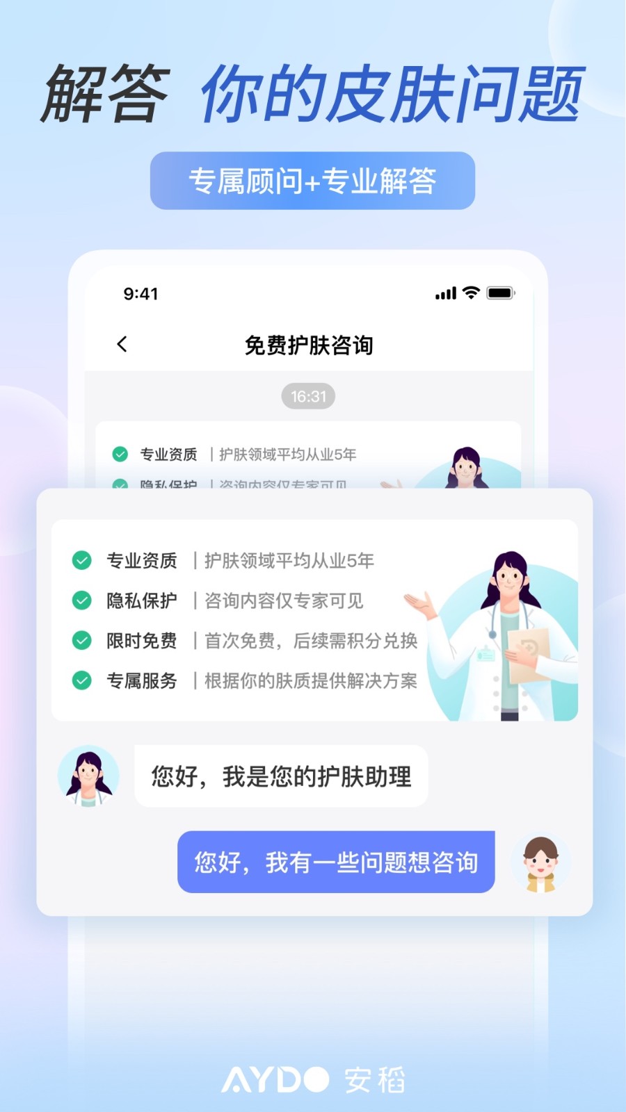 2、咨询服务:点击此处,即可跟护肤专家进行1对1咨询,解决你的皮肤问题。