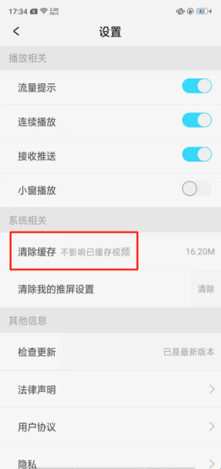 3、往下滑动,点击【清除缓存】即可。(不影响已经缓存的视频哦~)