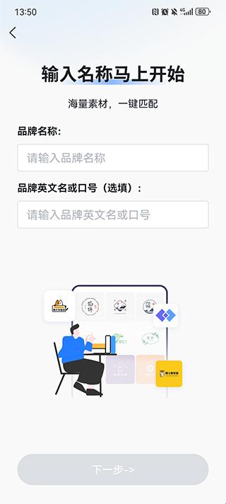 2、名称或口号:之后用户需要输入自己确定的品牌名称,还可以选择输入英文名或者口号,填完之后点击下一步即可。