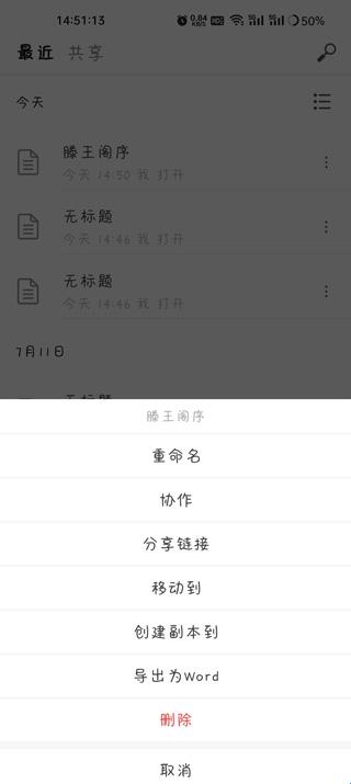 6、编辑完成的文档会保存在最近列表中,并且会自动保存在云端,并且可以导出为word文档。
