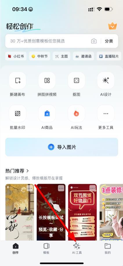 1、打开稿定设计APP,在主界面点击底部菜单栏中的AI工具选项。