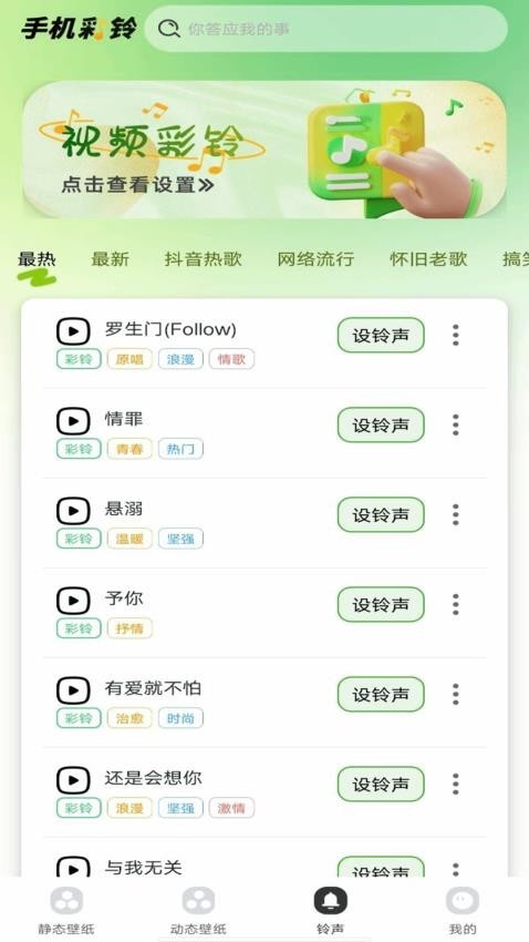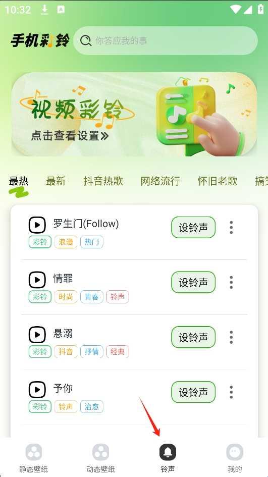 3、喜欢壁纸,点击免费应用即可;还有很多类型彩铃可以设置哦。