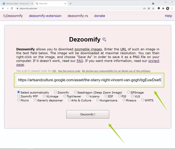 2、打开网页https://dezoomify.ophir.dev/,并将刚才复制的链接粘贴到下图所示区域,然后点击下方的Dezoomify!按钮;