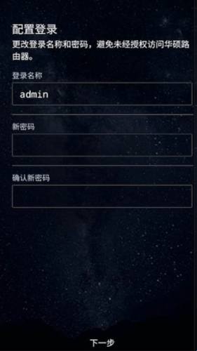 9、设置作为登录路由器设置页面的账号和密码,点击“下一步”。