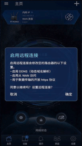 10、进入路由器设置页面后,会提示“启动远程连接”,若需要在外网通过华硕路由器APP访问路由器设置页面请点击“确定”。