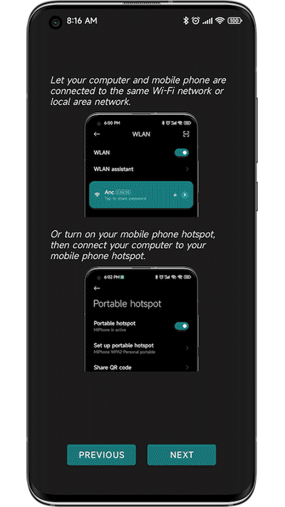 2、如图,需要手机与电脑保持在同一网络下。可以是手机分享热点给电脑连接网络;也可以是让电脑网络连接到局域网内的路由器以达到连接效果