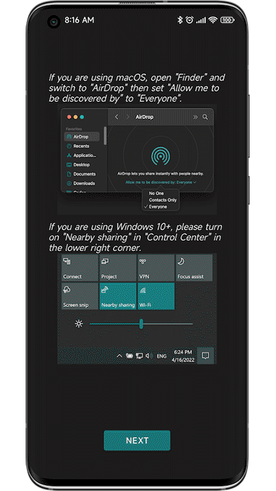 1、如图,AndDrop区分mac端与Windows端,但是都大差不差,只需要在电脑上打开分享的相关功能等待连接即可