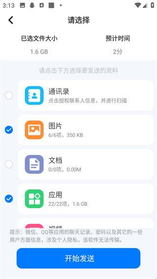 2、可以一键传输图片,频频,备忘录,通讯录,提醒事项等。