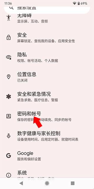 2、点击含有账号关键字的选项,来到下方界面,在机主账号下方可以看到google登录的账号点击它