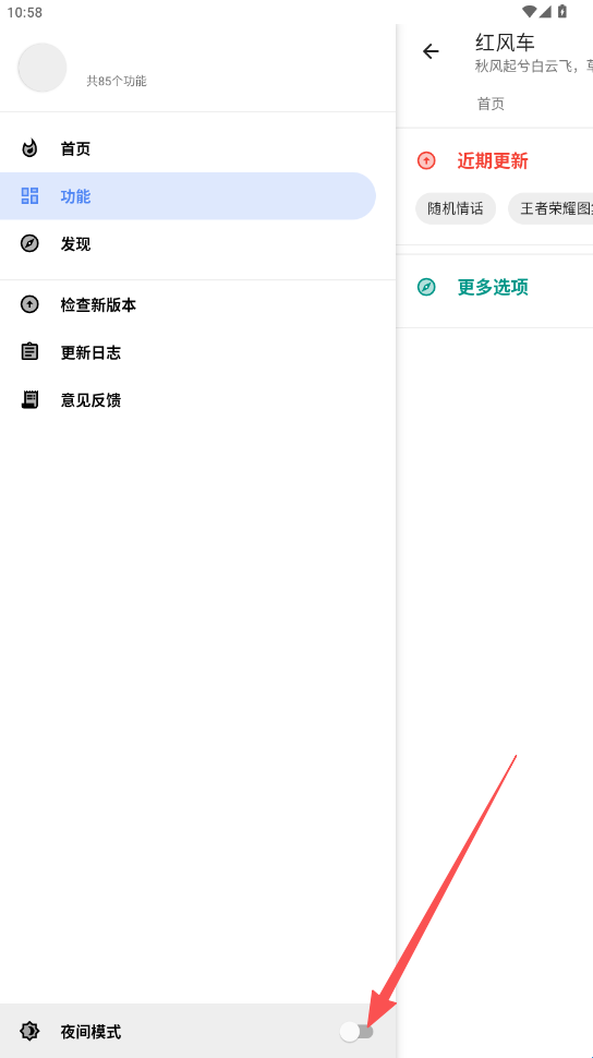 点击左上角“三”图标,右下角可以切换夜间模式喔